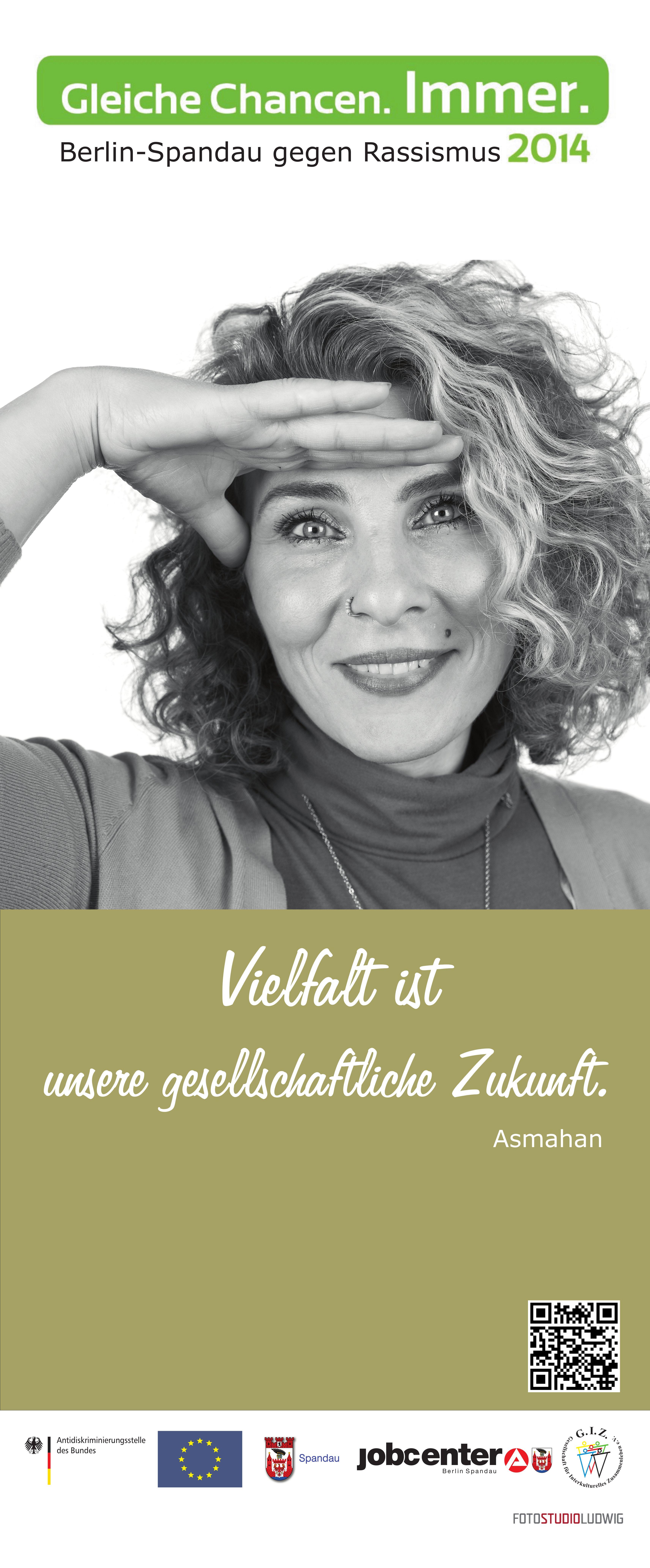 Unterstützt durch die Antidiskriminierungsstelle des Bundes und das PROGRESS Programm der Europäischen Union werden 30 Großporträts von Spandauer Bürgerinnen und Bürger mit Migrationshintergrund und ihrer persönlichen Botschaft ,,Vielfalt ist …'' in einem großen Kreis vor dem Spandauer Rathaus aufgestellt.