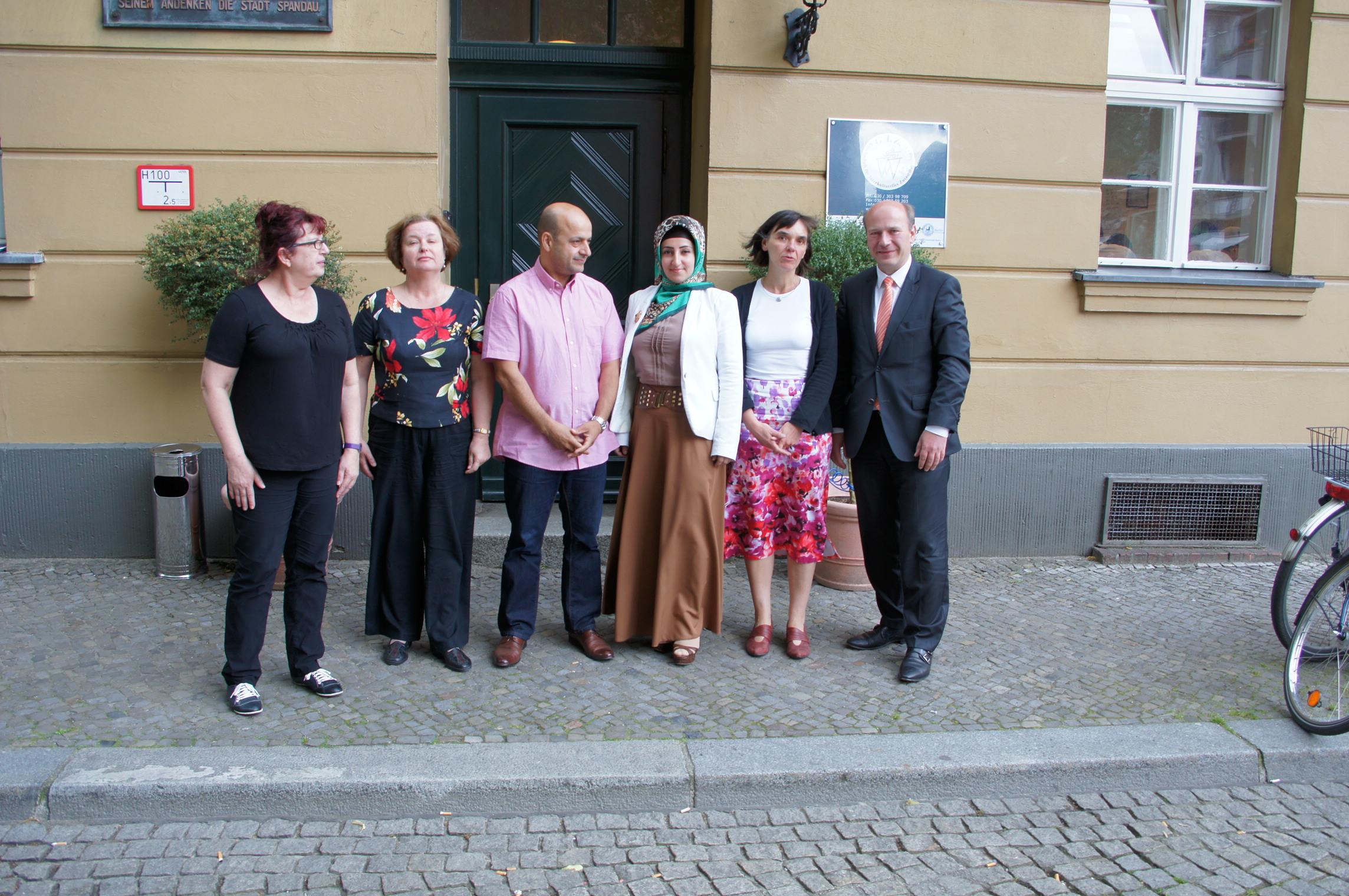 Auf dem Bild sind die Spandauer Integrationslotsen, Frau Dr. Britta Marschke (Geschäftsführerin von GIZ e. V.) und Herr Kai Wegner (Generalsekretär der CDU Berlin) vor dem ''GIZ-Haus'' zu sehen.