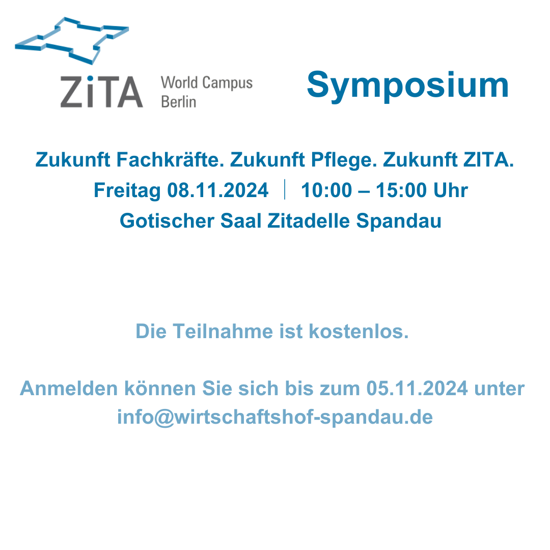 am 8. November 2024 um 10:00 Uhr laden wir Sie herzlich zum Symposium „Zukunft Fachkräfte. Zukunft Pflege. Zukunft ZITA“ in die Zitadelle Spandau ein.