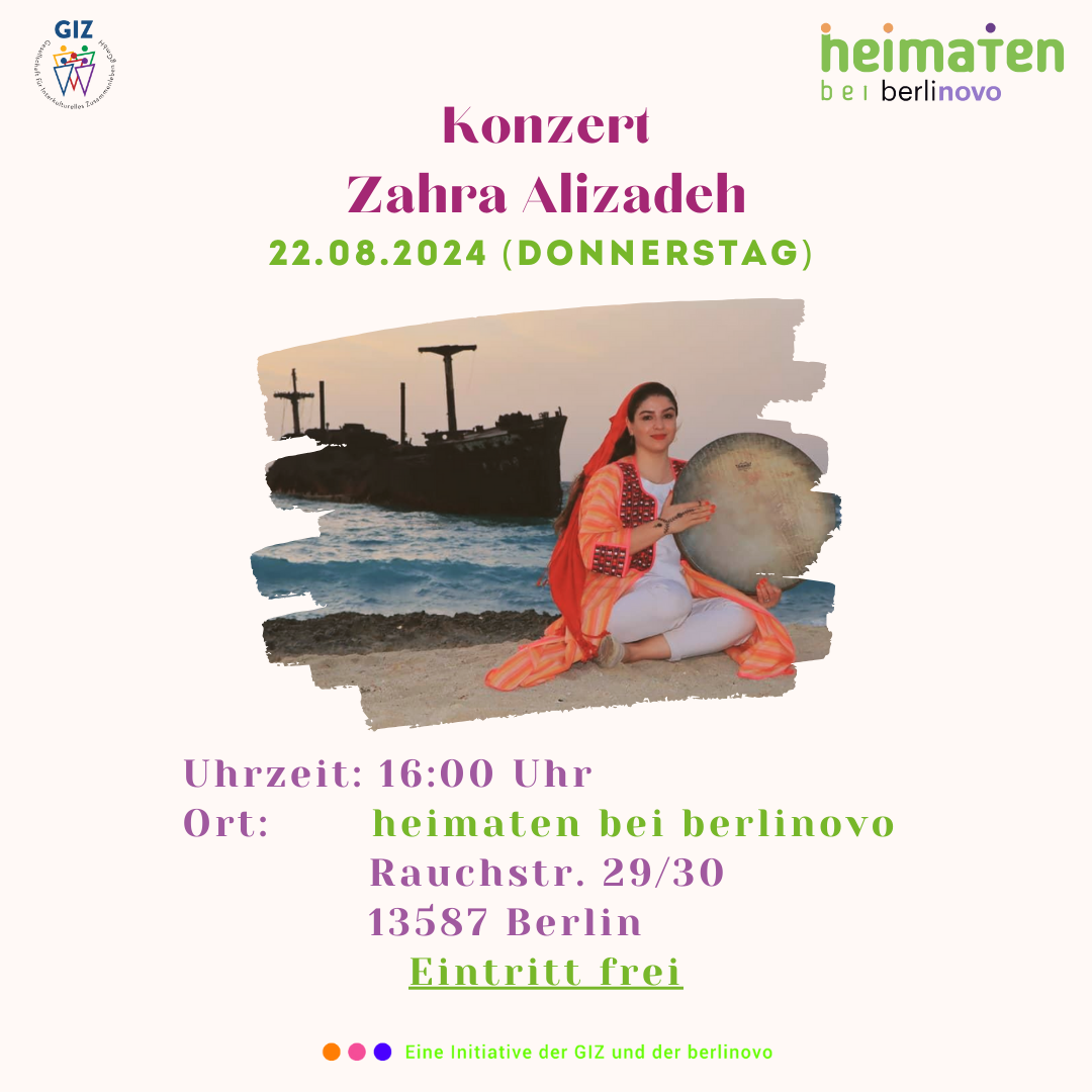 Am 22. August 2024 um 16:00 Uhr laden wir Sie herzlich ein zum Konzert der Künstlerin Zahra Alizadeh! Zahra spielt das traditionelle persische Instrument Daf und auch andere Schlaginstrumente. Eine Melodie, die sie spielt, werden einige von Ihnen bereits kennen - seit Januar dieses Jahres haben wir eine neue, entspannende Warteschleifenmusik, die Zahra exklusiv für die GIZ komponiert und aufgenommen hat.