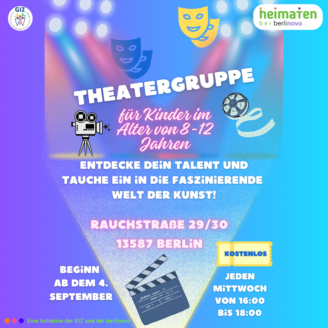 ab dem 4. September 2024 (Mittwoch) startet ein neuer Kurs für Kinder bei heimaten bei berlinovo! Unsere ehrenamtliche Helferin und Pädagogin Frau Krunich lädt Kinder im Alter von 8 bis 12 Jahren ein, unter ihrer Leitung an der Theatergruppe teilzunehmen. Dabei können die Kinder ihrer Kreativität freien Lauf lassen, ihre Persönlichkeit und ihr Selbstbewusstsein stärken und in die faszinierende Welt der Schauspielkunst eintauchen!