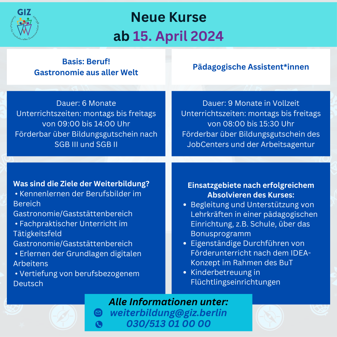 Wenn Sie Fragen zu einem der Kurse haben und/oder sich für einen Kurs anmelden möchten, schreiben Sie eine kurze E-Mail an weiterbildung@giz.berlin oder rufen Sie uns an unter: 030 / 513 01 00 00.