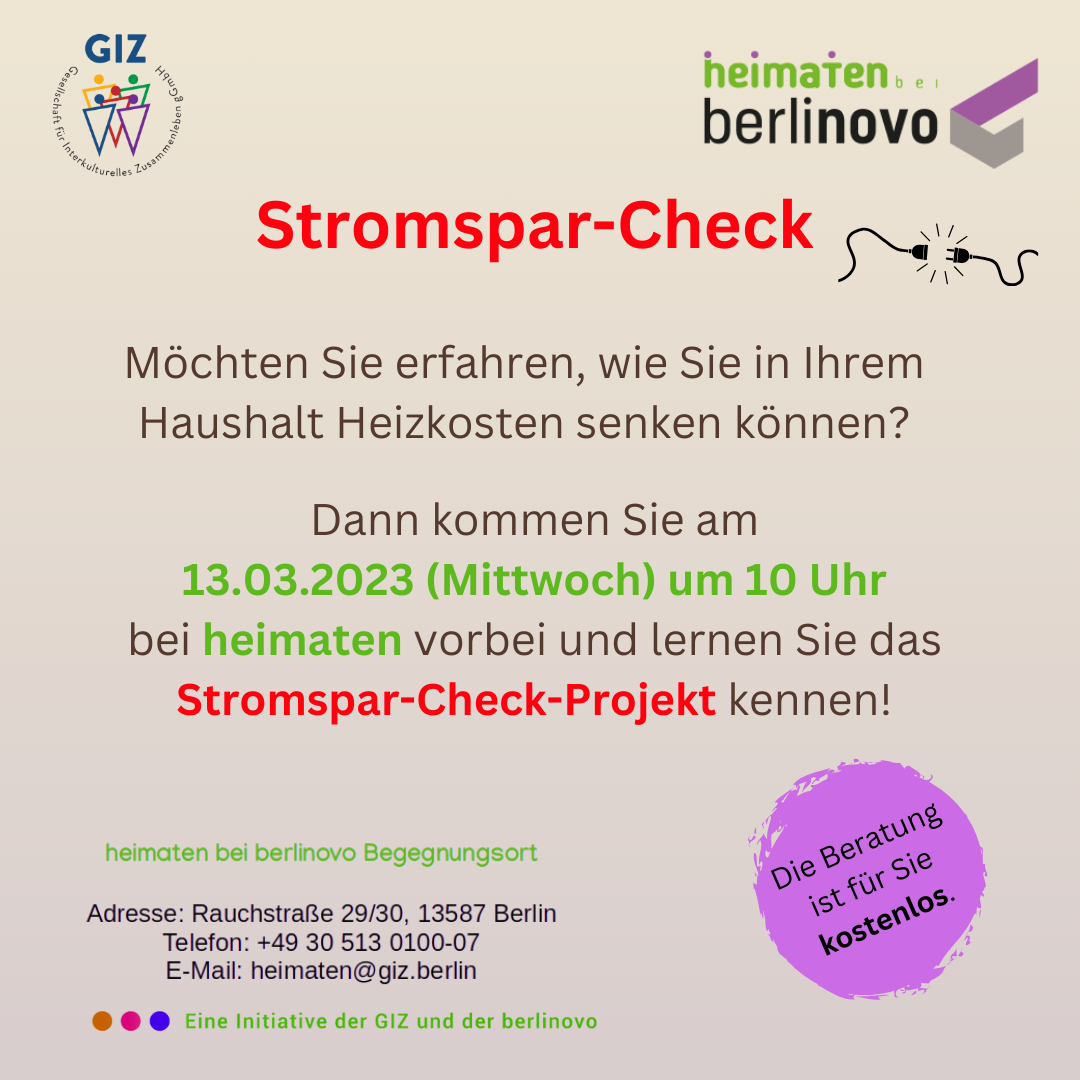 Wir laden Sie zur Vorstellung eines neuen Angebotes zur Überprüfung der Heiz- und Betriebskosten innerhalb des Stromspar-Checks ein! Das Verbundprojekt der Caritas Berlin und des Bundesverbandes der Energie- und Klimaschutzagenturen bietet Menschen mit geringem Einkommen, niedriger Rente oder Beziehenden von Bürgergeld und anderer Sozialleistungen eine kostenlose Energiersparberatung.
