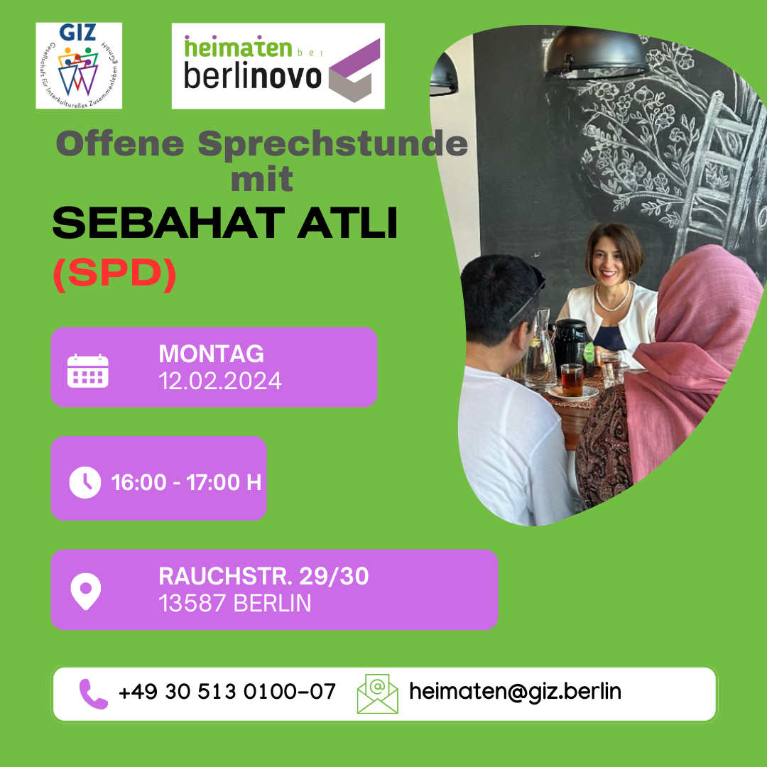 Am 12.02.2024 um 16:00 h freuen wir uns erneut auf Frau Sebahat Atli (SPD). Wie bereits im vergangenen Jahr, wird Frau Atli wieder eine offene Sprechstunde bei „heimaten bei berlinovo“ anbieten. Jede Bürgerin und jeder Bürger kann sich mit ihren bzw. seinen Anliegen an Frau Atli wenden, welche sich für die Interessen der Spandauerinnen uns Spandauer einsetzt und ihre Anliegen ernst nimmt.
