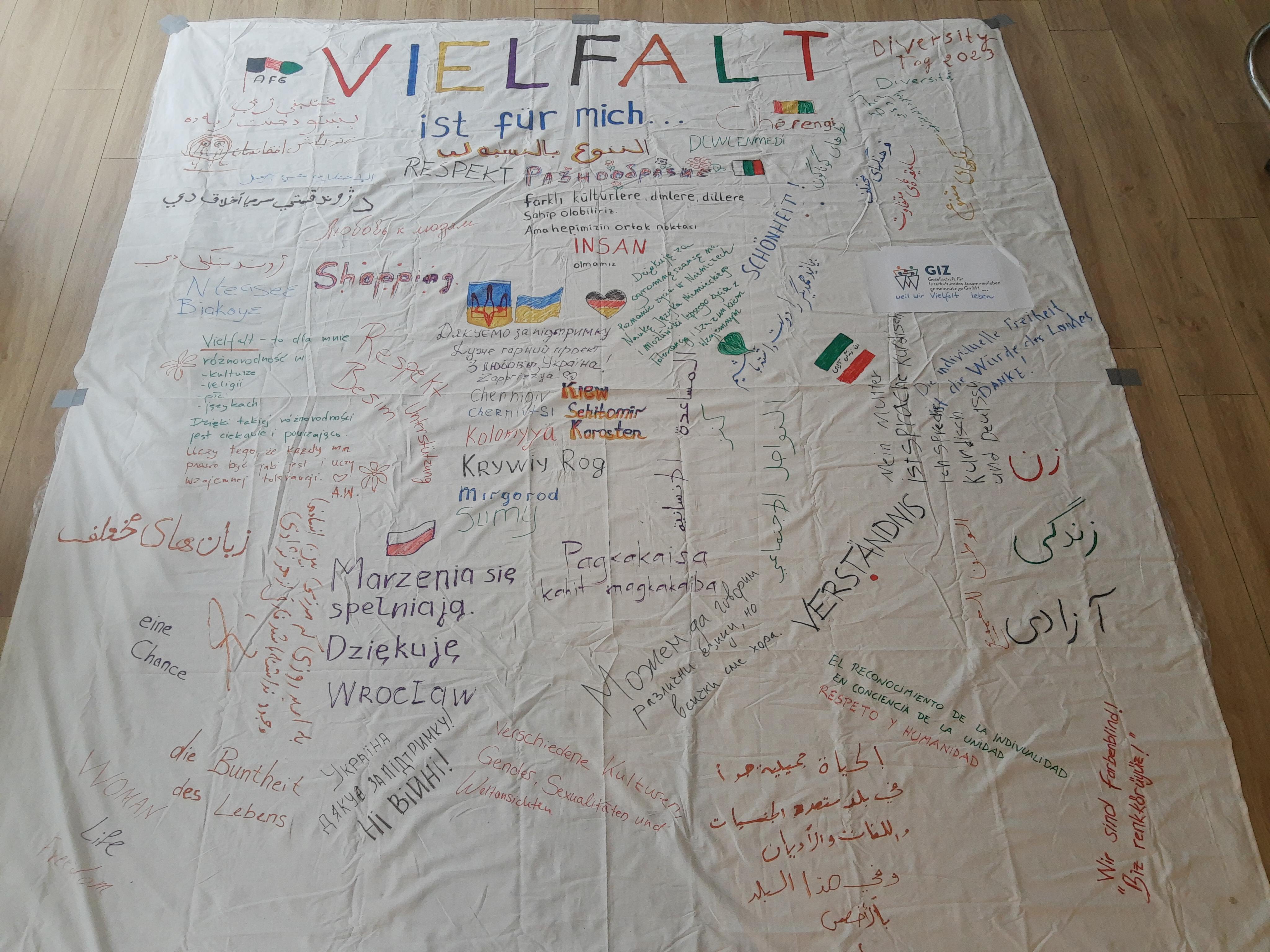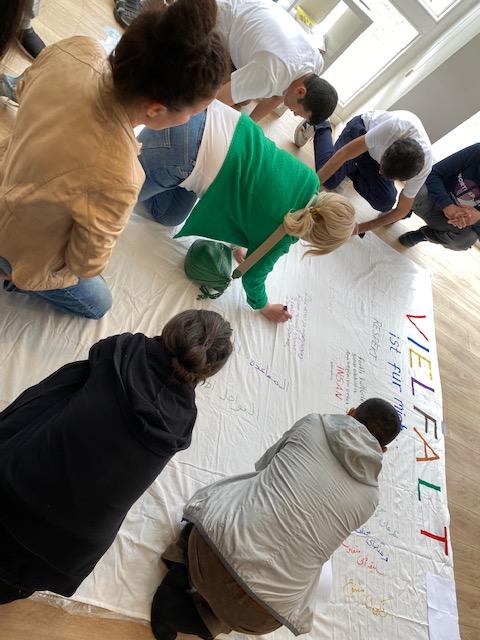 Anlässlich des „Diversity-Tag“ am 23 Mai haben wir eine Aktion zum Thema Vielfalt gestartet. Auf einem Bodenplakat mit dem Motto "Vielfalt ist für mich...." konnte jede*r Passant*in im Büro der Integrationslots*innen seine eigene Botschaft hinterlassen und den Satz vervollständigen. Wir danken Euch fürs Mitmachen und freuen uns über die Vielzahl und Vielfalt der Antworten - ganz im Sinne der Aktion!