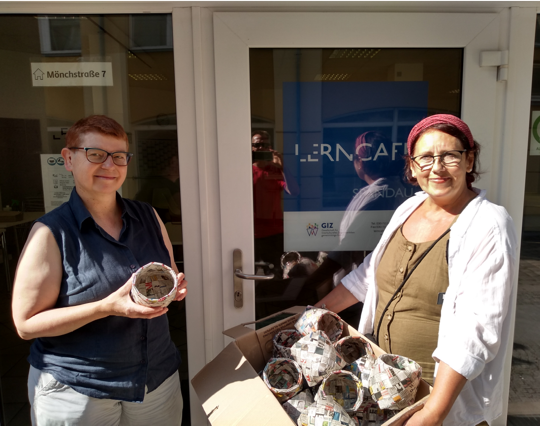 Am 5. Juli wurde dem Lerncafe Spandau von Goldnetz gGmbH durch die Projektleitung, Frau Koletzki, eine große Kiste mit handgefertigten, nachhaltig produzierten Stiftbehältern überreicht. Diese wurden von Mitarbeiter*innen aus dem Kreativbereich aufwändig aus Zeitungsstreifen geflochten und mit einer schützenden Folienschicht versehen. Im Beschäftigungsprojekt für Langzeitarbeitslose werden gespendete Materialien up- bzw. recycelt und an gemeinnützige Einrichtungen abgegeben oder auf den Sozialmärkten verkauft (https://www.goldnetz-berlin.org/).