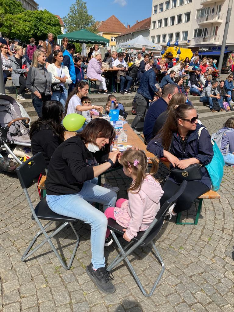 Auch auf dem Marktplatz ging es hoch her: Beim Kinderfest des Bezirksamtes wurde eine große Spendenaktion durchgeführt, bei der es blau-gelbe Schleifen gegen Spende für die Projekte der GIZ zugunsten der ukrainischen Geflüchteten gab.
