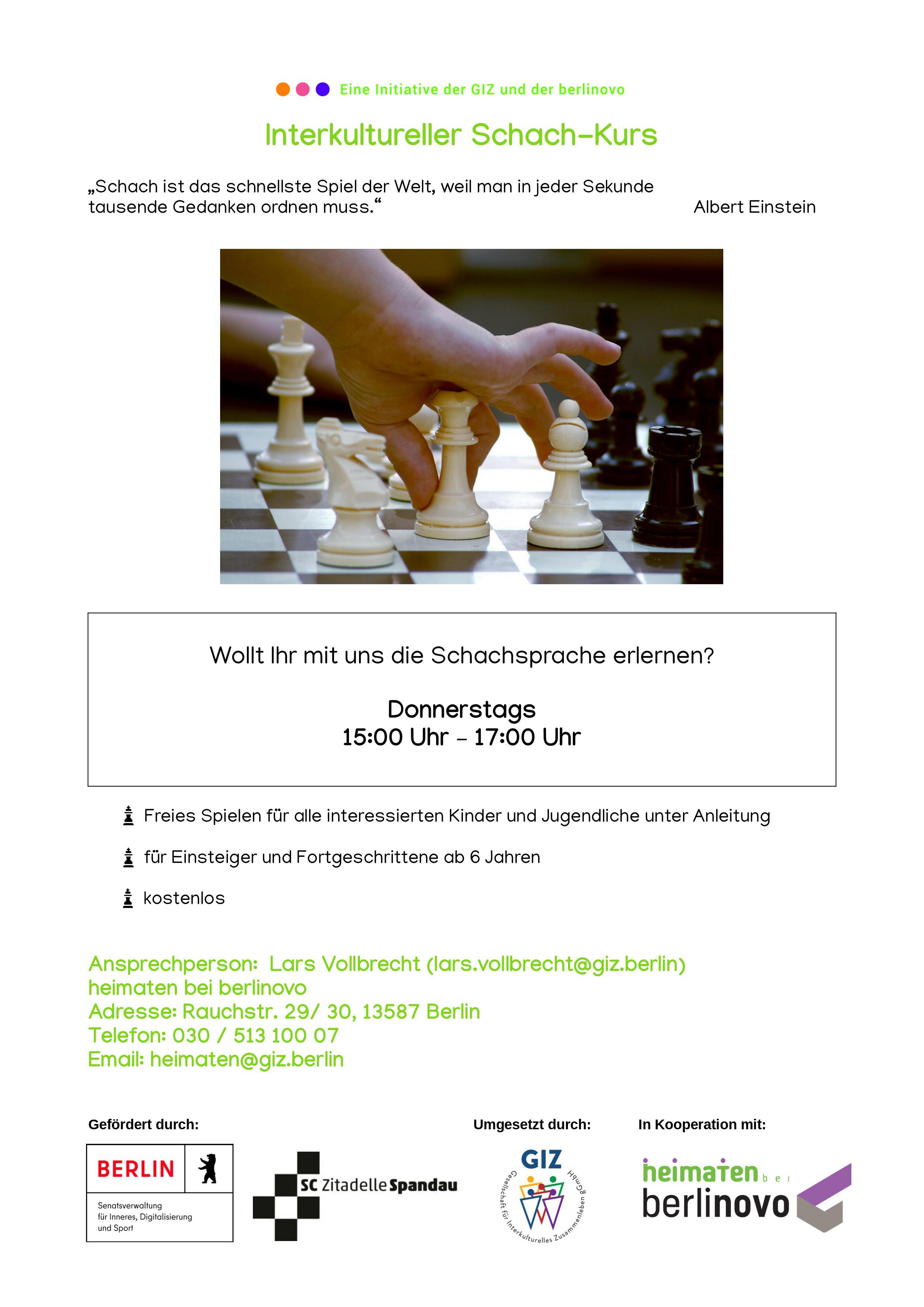 Im Begegnungscafé heimaten bei berlinovo in Hakenfelde können Kinder und Jugendliche ab 6 Jahren jeden Donnerstag von 15 bis 17 Uhr Schach spielen oder sich die Grundregeln und Schachzüge erklären lassen, und diese gleich anwenden.