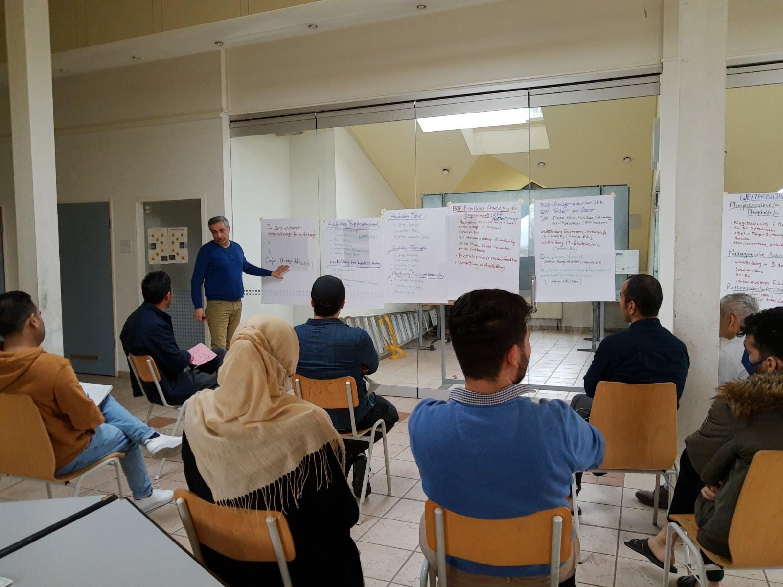 Das Willkommen-in-Arbeit Büro (WiA-Büro) Spandau hat 2022 vier Inforunden in Spandauer Gemeinschaftsunterkünften für Geflüchtete (GU) in Kooperation mit dem Jobcenter Spandau und bridge – Berliner Netzwerke für Bleiberecht durchgeführt. Diese Inforunden mit dem Titel „Arbeiten in Berlin. Eine erste Orientierung“ hat den Bewohner*innen der GUs Rauchstraße (31.03.2022), Spandauer Straße (14.04.2022), Freudstraße (05.05.2022) und Pichelswerder Straße (24.05.2022) einen ersten Einblick unter anderem zu den Themen Sprachkurse, Ausbildungsmöglichkeiten und Jobcoaching ermöglicht. Darüber hinaus wurden die Beratungsangebote des WiA-Büros Spandau sowie des bridge Netzwerks umfangreich vorgestellt. Nach den Inputs durch das Jobcenter, bridge Netzwerk und WiA-Büro Spandau wurden Einzelgespräche mit den Bewohner*innen durchgeführt und dadurch offene Fragen geklärt und Beratungstermine vereinbart.