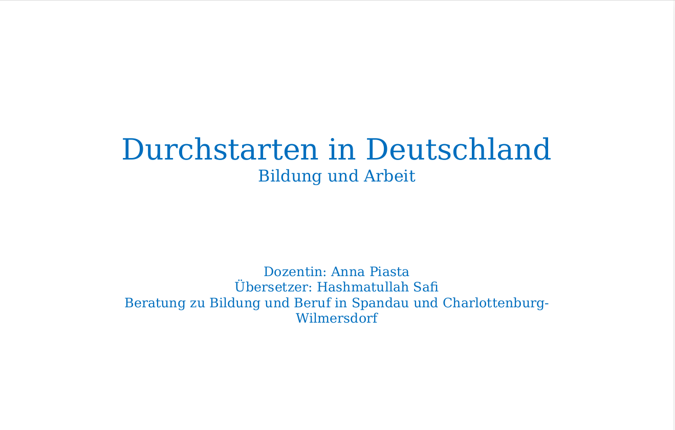 WiA-Büro: Info-Veranstaltungen für afghanische Ortskräfte „Durchstarten in Deutschland - Bildung und Arbeit" (Beratung zu Bildung und Beruf Spandau/Charlottenburg-Wilmersdorf) und „Einführung in den deutschen Bildungs- und Arbeitsmarkt“ (agens Arbeitsmarktservice gGmbH) in Kooperation mit YAAR e.V.