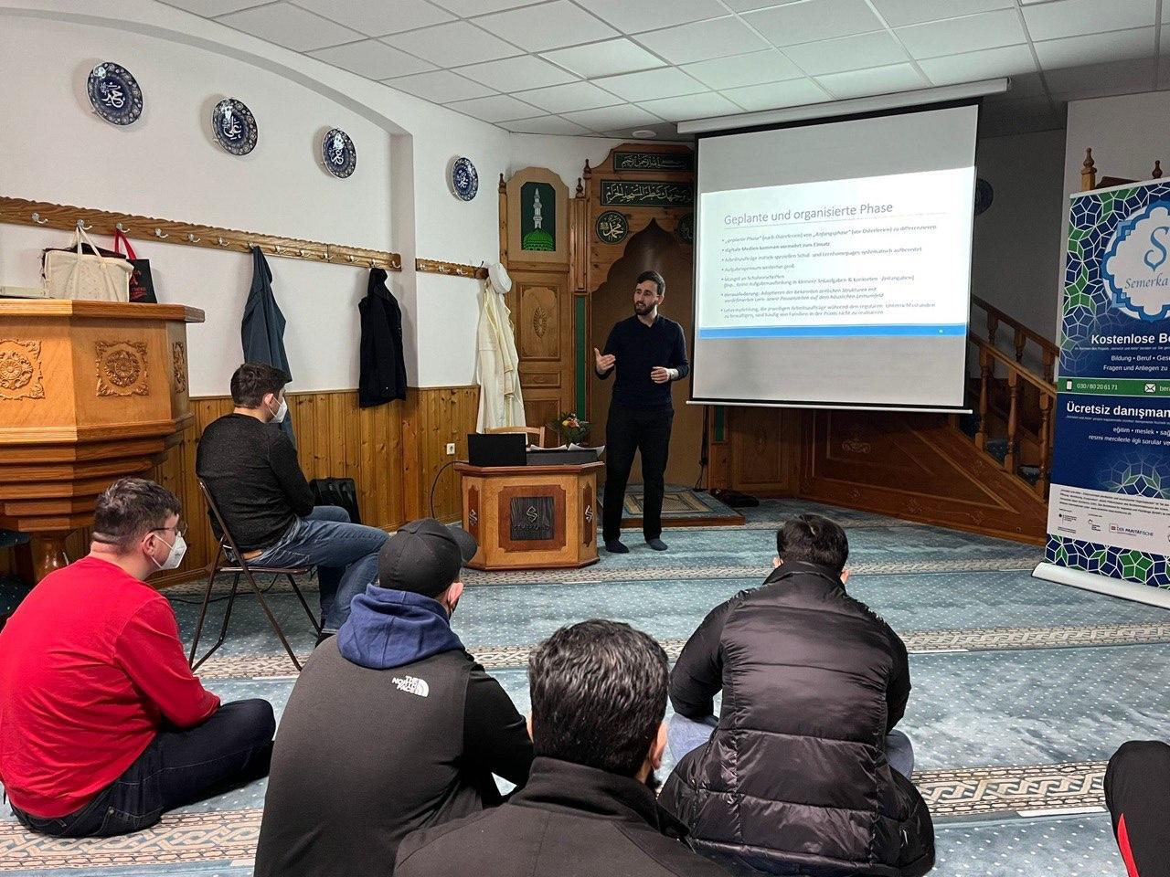 Den Auftakt bildete der Workshop „Homeschooling - Das Erlernen von Selbstmanagement und Medienkompetenz bei Oberschüler*innen während der Corona-Pandemie - Herausforderungen und Chancen“ in der Semerkand-Moschee. In einem interaktiv gestalteten Workshop stand Bildungsreferent Hamdi Barisik den zahlreichen Fragen von Eltern und Schüler*innen zu diesem hochaktuellen Thema Rede und Antwort.