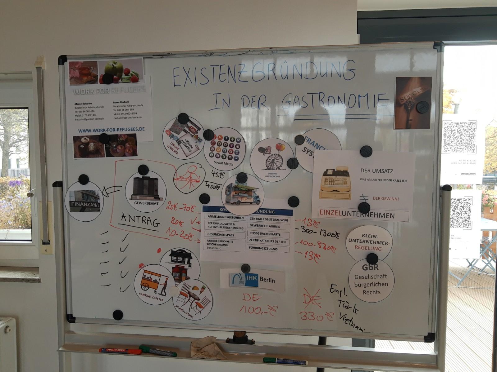 Am 03.11.2021 von 10:00-12:00 h fand der Workshop „Existenzgründung in der Gastronomie“ in Kooperation mit Work For Refugees (WfR) statt. Referentin Afsané Bouzrina (WfR) hat die Teilnehmer*innen hinsichtlich der relevanten Behörden, Formularen und Erlaubnisse für Existenzgründung informiert sowie wichtigste Begrifflichkeiten geklärt. Der Workshop wurde durch Reem Derhalli (WfR) und Sara Moini (WiA-Büro Spandau) ins Arabische und Farsi übersetzt. Während der Fragerunde wurden auch zahlreiche praktische Hinweise mitgeteilt.