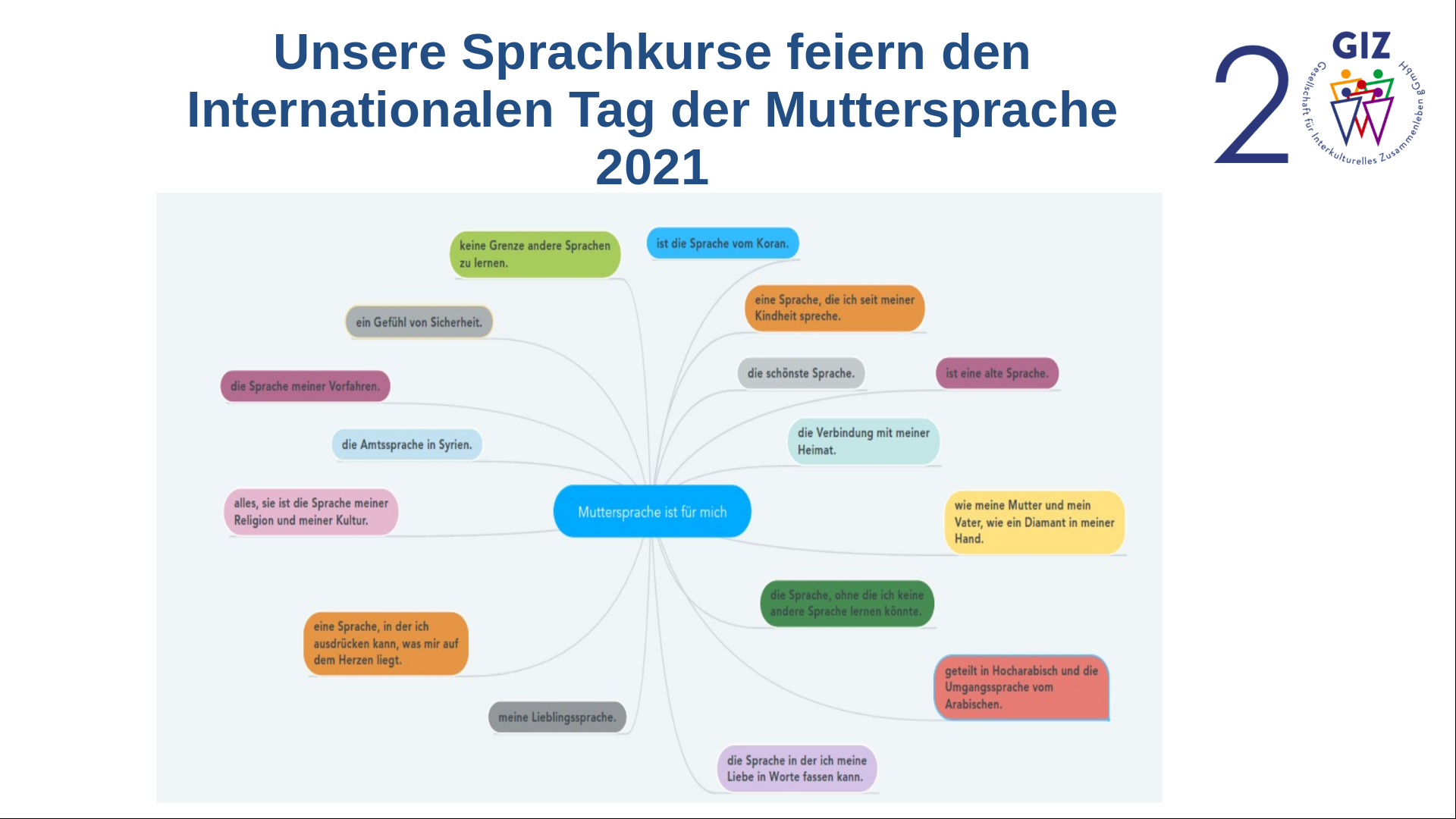 Menschen mit den verschiedensten Muttersprachen lernen tagein tagaus die deutsche Sprache bei der Gesellschaft für Interkulturelles Zusammenleben (GIZ gGmbH). Sie besuchen Integrationskurse und Alphabetisierungskurse mit dem Ziel, Deutsch als zweite Sprache zu lernen, um als aktive Akteure an der deutschen Gesellschaft partizipieren zu können. Doch welchen Stellenwert hat dabei die Muttersprache?