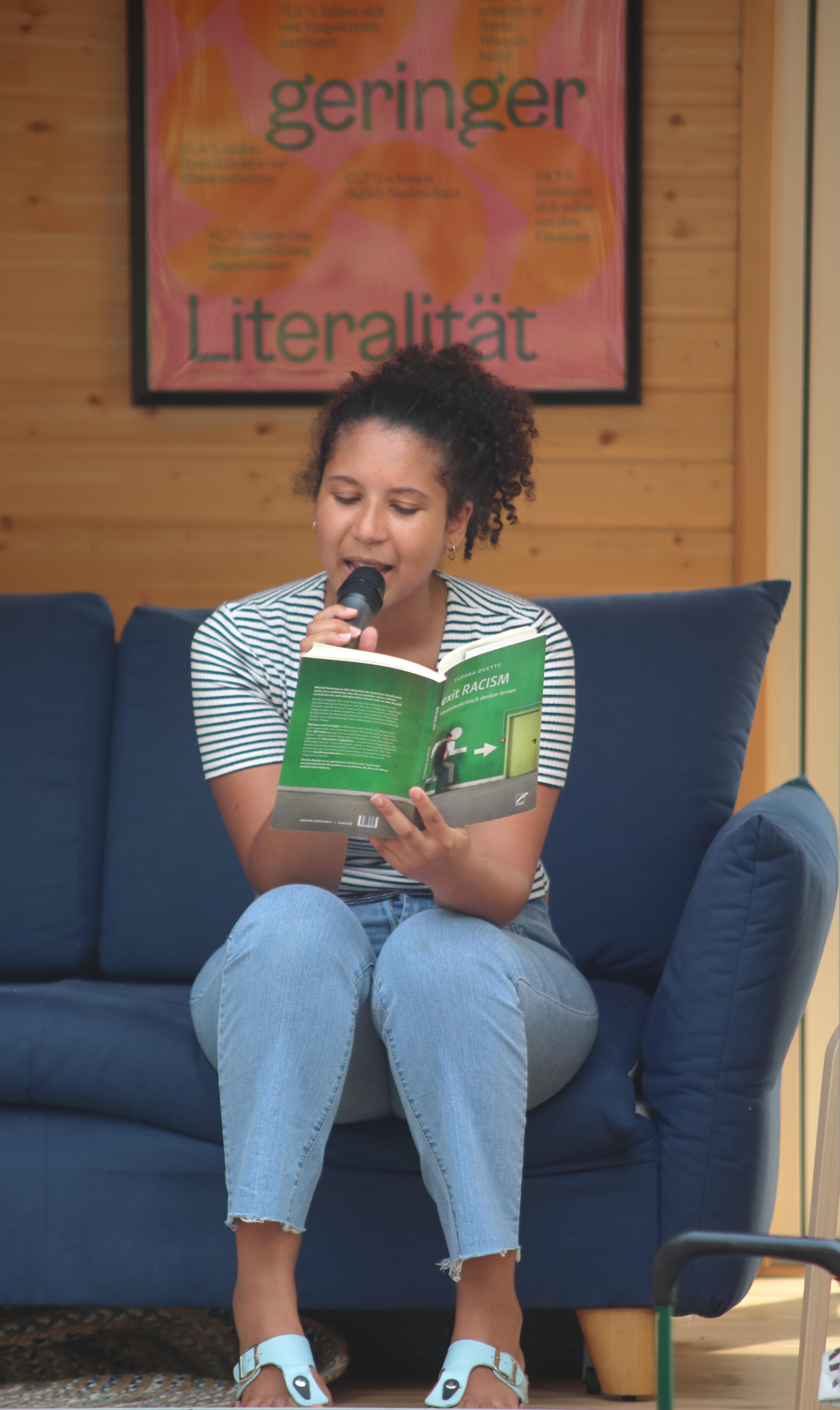 Anschließend las das Team den Besucher*innen und Anwohner*innen exemplarische Ausschnitte aus zwei Publikationen zum Thema Rassismus und Inter*Trans*-Identitäten auf der Lesebühne im Tiny-House vor: