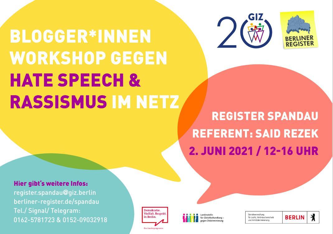 Weitere Infos zum „Blogger*innen-Workshop gegen Rassismus und Hate Speech“ vom 2. Juni 2021 erhalten Sie unter: register.spandau@giz.berlin