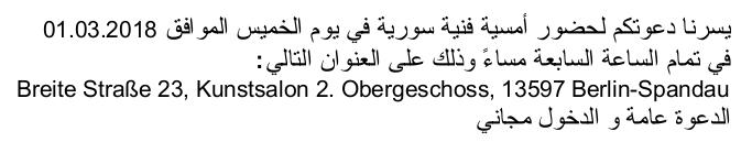 Erstmals findet in der Galerie Spandow ein Abend der syrischen Kunst statt. Gemeinsam mit Frau Katrin Germershausen der Inhaberin der Galerie Spandow haben wir diesen Abend mit zwei wunderbaren Künstlern für Sie organisiert.