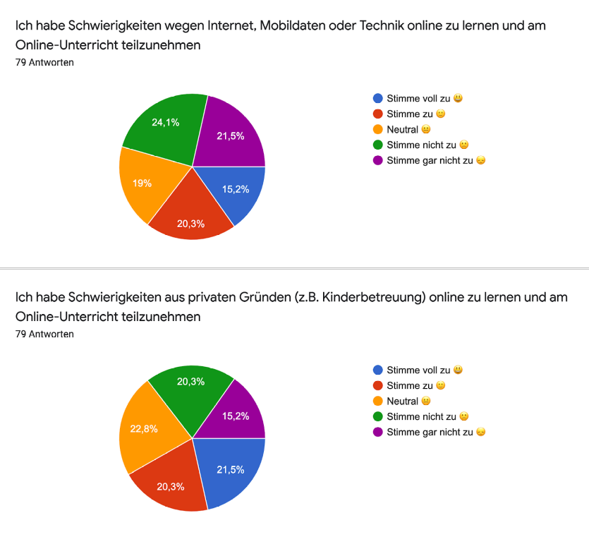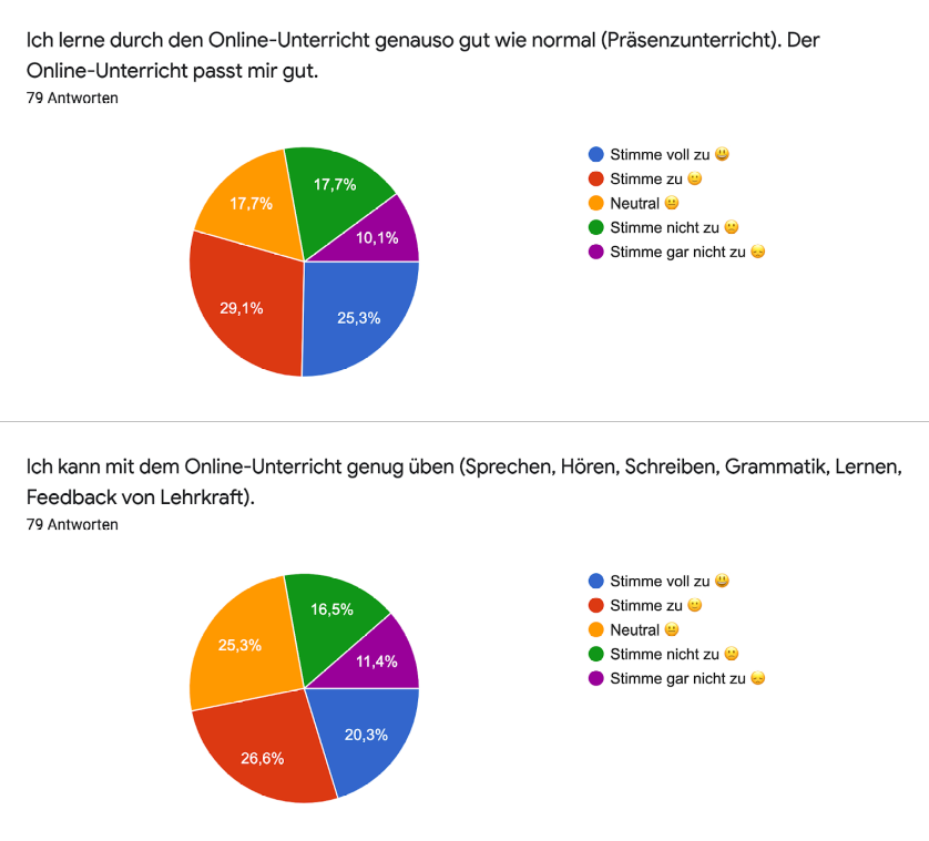Von Anfang Mai bis Ende Mai wurde eine anonyme und freiwillige Umfrage mit den Teilnehmenden der Online-Sprachkurse durchgeführt. Ziel dieser Umfrage war es zu erfahren, wie die Situation und das Gefühl für die Teilnehmenden im Umgang mit der Situation der vergangenen Monate war. Ein zentrales Anliegen war es ebenfalls die Umfrage möglichst niedrigschwellig und zugänglich zu gestalten, so dass es nur vier geschlossene Fragen sowie eine offene Frage, die freiwillig beantwortet werden konnte, gab.
