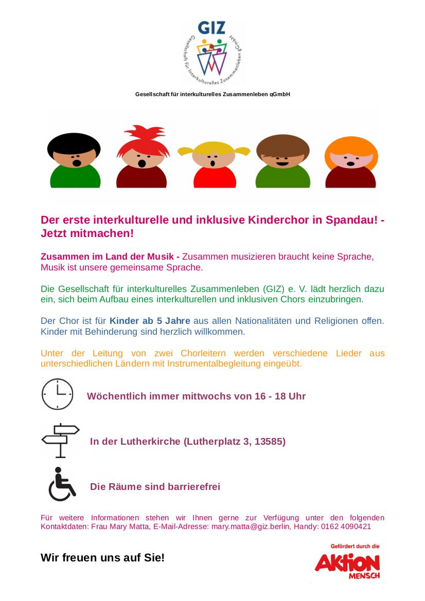 Der Chor ist für Kinder ab 5 Jahre aus allen Nationalitäten und Religionen. Kinder mit Behinderung sind herzlich willkommen. Die Räume sind barrierefrei.