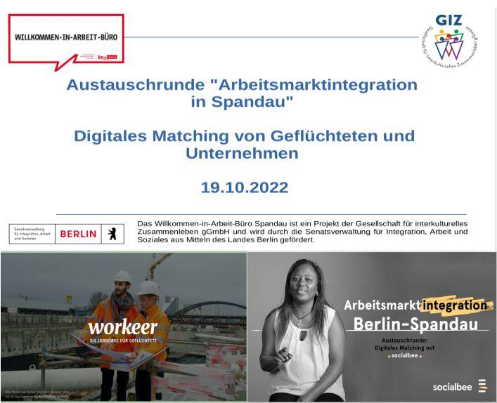 Am 19.10.2022 fand die zweite Austauschrunde „Arbeitsmarktintegration in Spandau“ des Willkommen-in-Arbeit-Büros (WiA-Büro) Spandau, diesmal mit dem Thema „Digitales Matching von Geflüchteten und Unternehmen" statt.