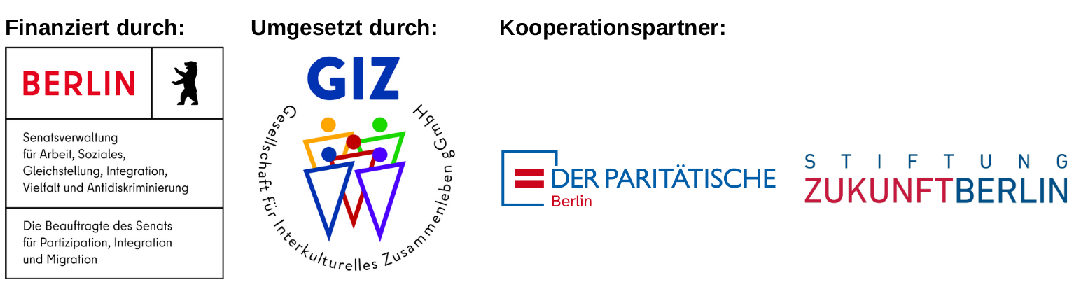 Das Projekt „Work for Refugees“ wird von der Senatsverwaltung für Arbeit, Soziales, Gleichstellung, Integration, Vielfalt und Antidiskriminierung gefördert und umgesetzt durch die Gesellschaft für interkulturelles Zusammenleben gGmbH und den Kooperationspartnern im Projekt Paritätische Wohlfahrtsverband LV Berlin e.V. sowie Stiftung Zukunft Berlin.